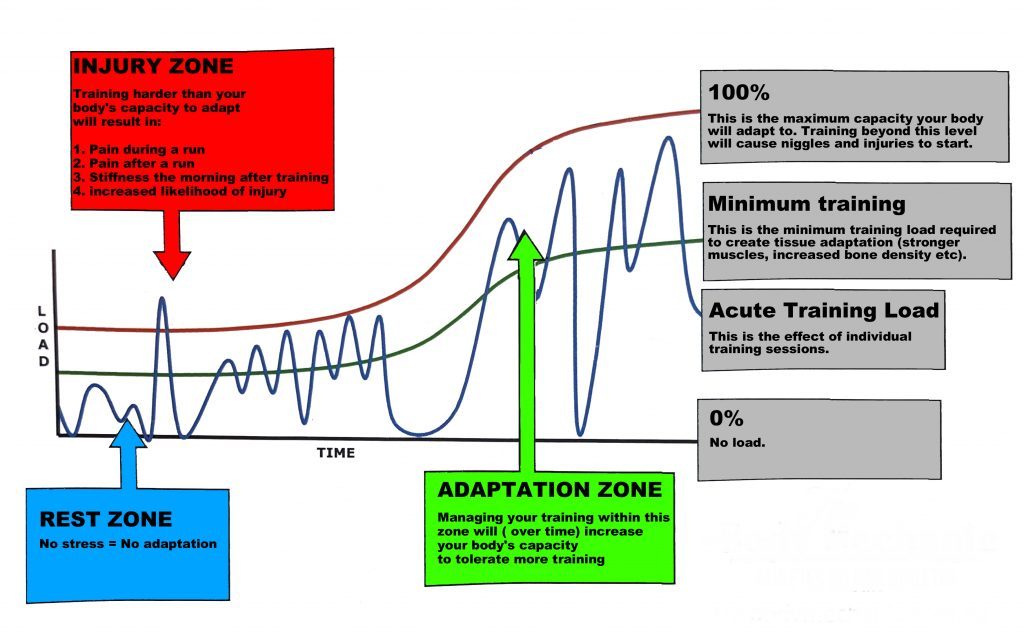 Most running injuries can be classified as “overuse injuries”. These injuries occur when the applied load (training) is greater than the body’s capacity to adapt (repair).